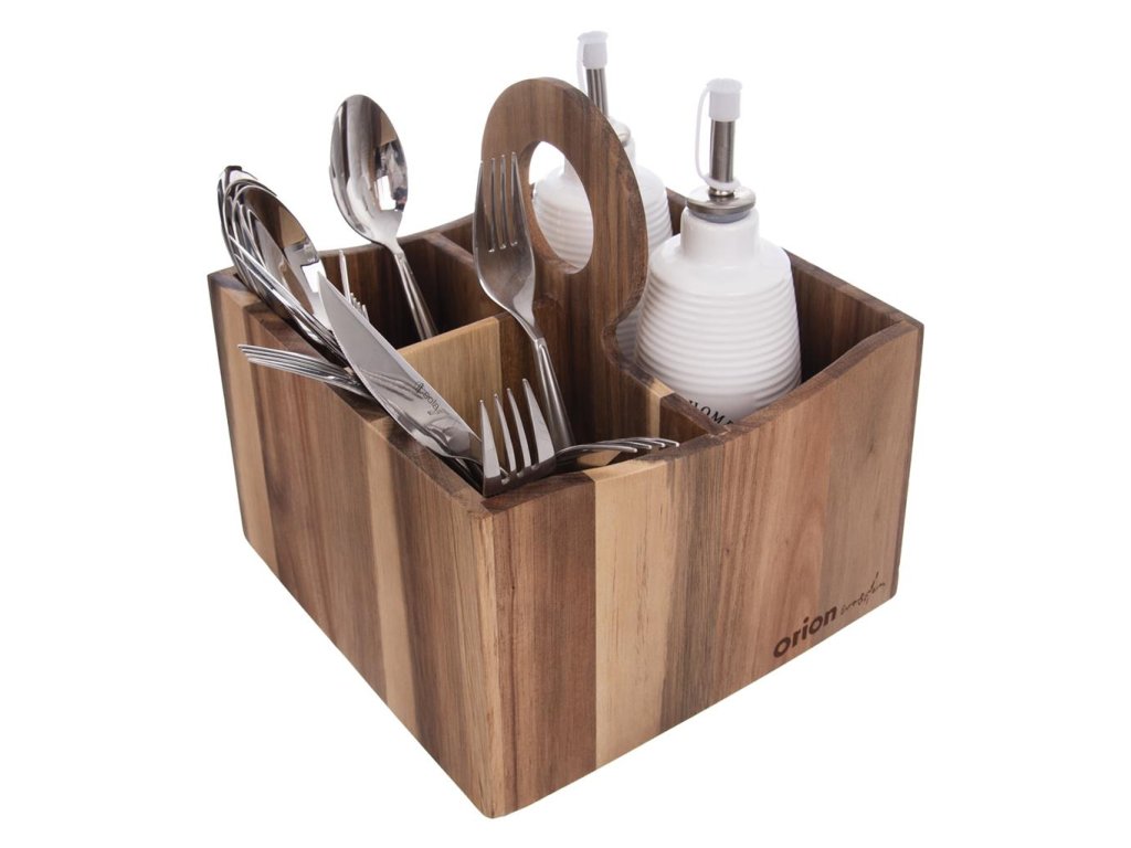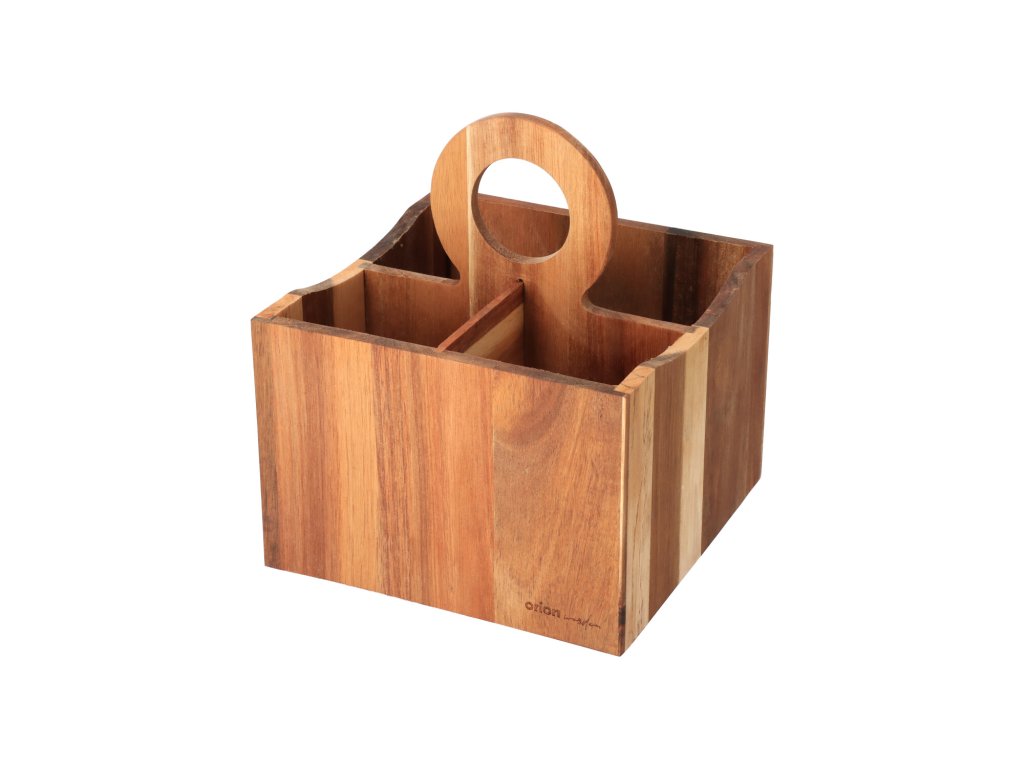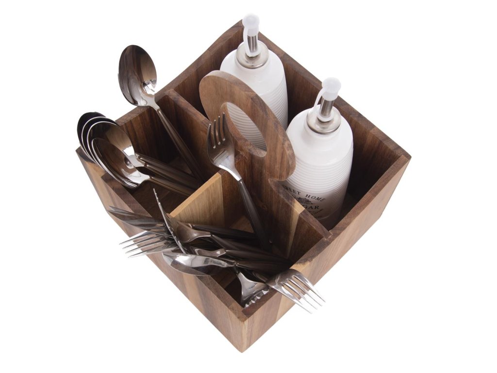 De standaard van acaciahout is geweldig voor het opbergen van bestek, maar ook van kruiden, sauzen of servetten. Het heeft drie vakken en dankzij het houten handvat is het gemakkelijk te dragen.