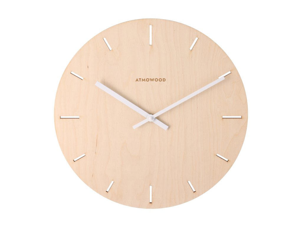 ATMOWOOD berkenhouten klok zonder cijfers 34 cm – witte wijzers