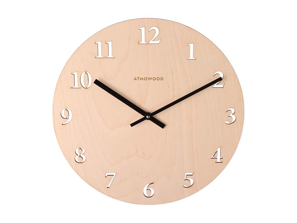 ATMOWOOD berkenhouten klok met cijfers 34 cm – zwarte wijzers