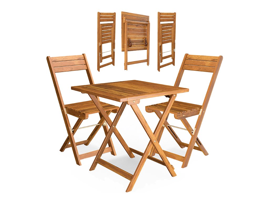 Deze praktische balkonset bestaat uit een tafel en twee stoelen en is gemaakt van hoogwaardig massief acaciahout. De hele set is inklapbaar, waardoor hij eenvoudig op te bergen is en ruimte bespaart. Het ruime tafelblad is ideaal voor een ontbijt, een kop koffie of om gezellig met vrienden te zitten op het balkon, terras of in de tuin.