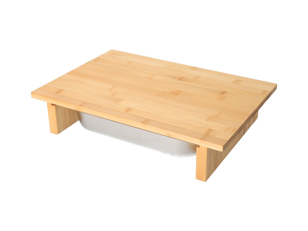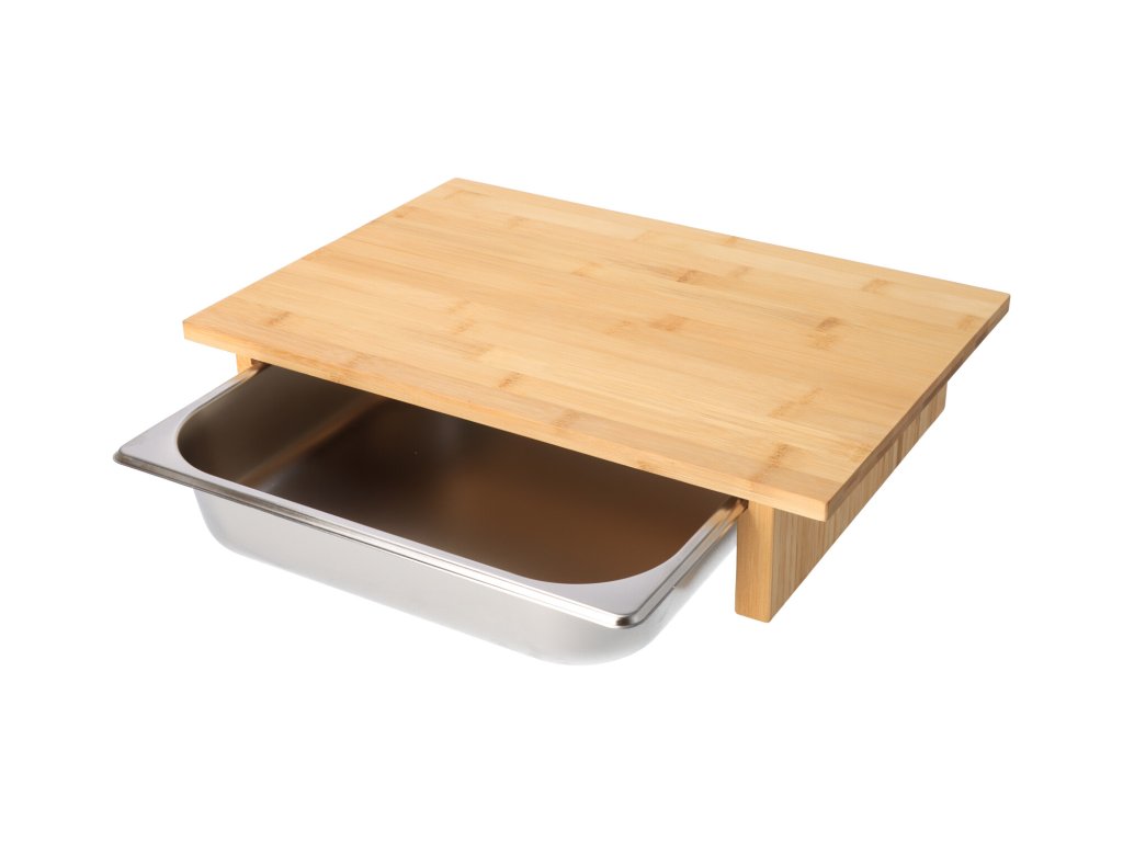 Dit elegante snijplankje van massief bamboe met een roestvrijstalen opvangbak is een zeer praktische hulp in elke keuken.