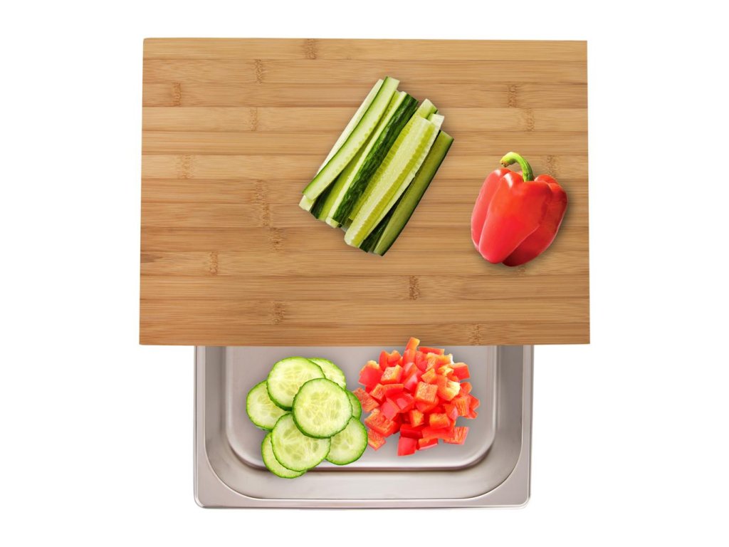 Op het snijplankje kun je gemakkelijk groenten, fruit of vlees voor goulash snijden. Alles schuif je vervolgens in de roestvrijstalen kom onder het snijplankje.
