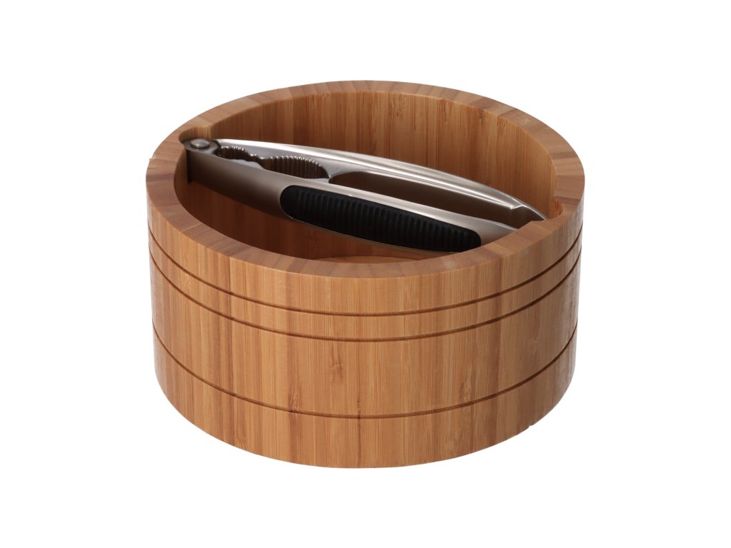 Stijlvolle bamboe kom met metalen notenkraker garandeert eenvoudig noten kraken, wat leuk zal zijn.