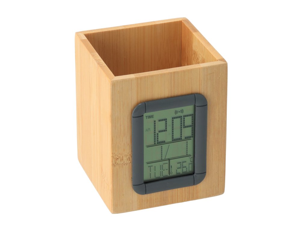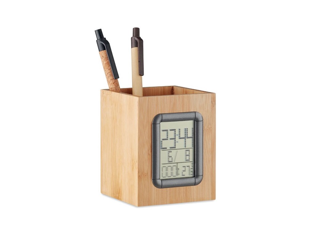 De bamboe houder voor schrijfgerei met een digitaal display zal een moderne aanvulling zijn voor op kantoor. Het heeft verschillende functies, waaronder een wekker, kalender of thermometer.