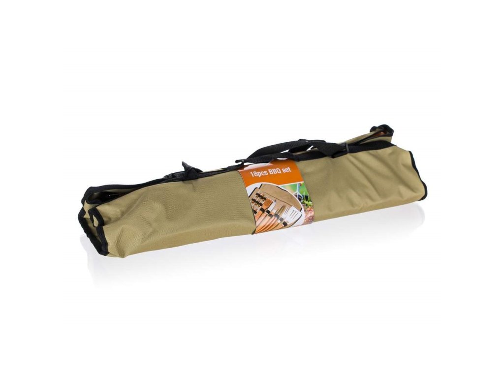 Een praktische houten 18-delige grillset is handig tijdens het zomerseizoen, en dankzij de tas waarin het gereedschap is verpakt, kunt u de set ook zonder zorgen op vakantie meenemen. Het grillgereedschap is uitgerust met lussen voor ophangen.