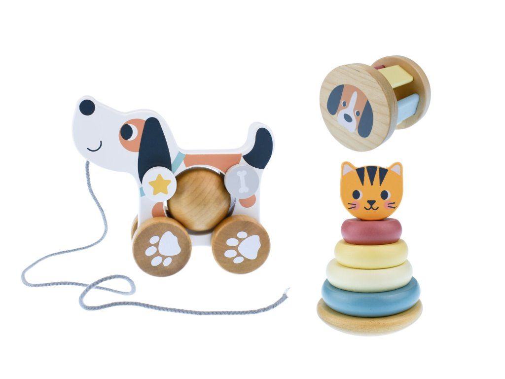 De set bevat drie klassieke houten speeltjes, geschikt voor kinderen vanaf ongeveer 12 maanden. Dankzij het gebruik van hoogwaardig hout met een glad en veilig oppervlak zijn de speeltjes duurzaam en kindvriendelijk.