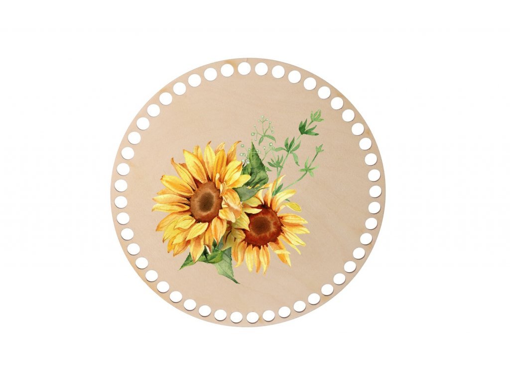 Rond houten deksel met een motief van gele zonnebloemen is gemaakt van berken multiplex van 3 mm dik. Het is geschikt voor het maken van gehaakte manden van touwgaren. In het aanbod hebben we verschillende maten.