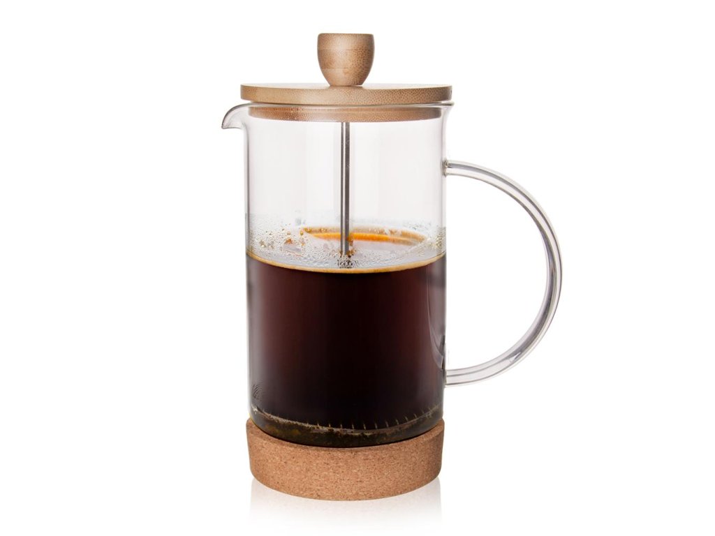 De French Press van 750 ml is gemaakt van borosilicaatglas dat hittebestendig is, met een kurken basis en een bamboe deksel. Het heeft een praktische handgreep, waardoor je de koffie gemakkelijk kunt inschenken.
