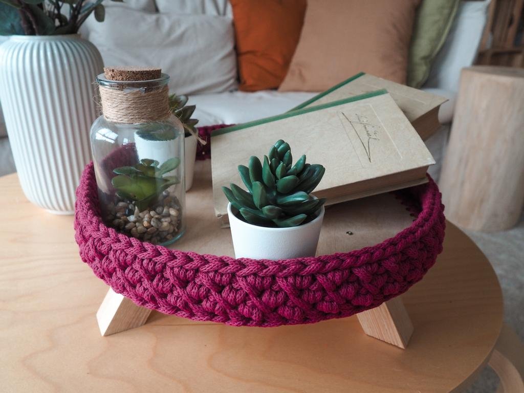 Een houten plantenstandaard dient voor het maken van interieurdecoratie volgens uw ideeën. U heeft alleen een haak nodig, garen Atmowood 5 mm in elke kleur en voor de afwerking een label met tekst op maat of een kleine uitsnede van multiplex.