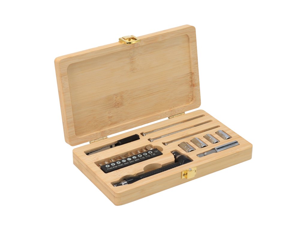 Praktische 21-delige gereedschapsset in een natuurlijke bamboe doos. De set bevat basisgereedschap dat altijd handig is om bij de hand te hebben in geval van nood. Perfect cadeau voor de doe-het-zelver of amateur-houtbewerker.