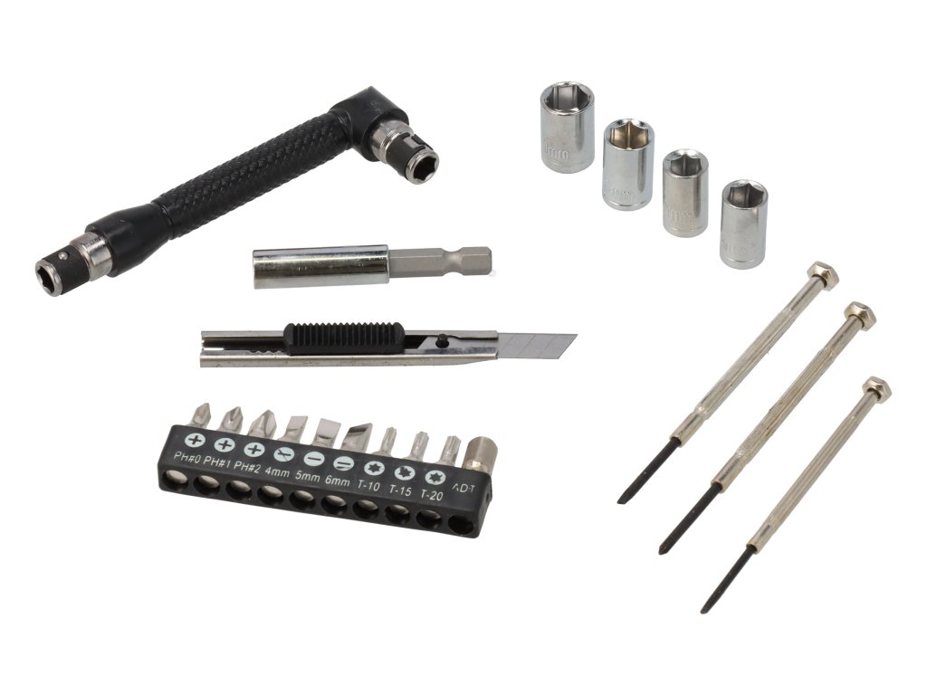 - 10 bits in houder (3 stuks met platte sleuf, 3 stuks met kruissleuf, 3 stuks torx - in de volksmond "ster", 1 stuk vierkante adapter)