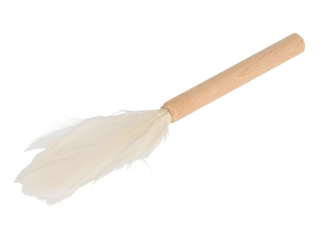 De kwast is gemaakt van beukenhout en stevig ingeklemde veren.