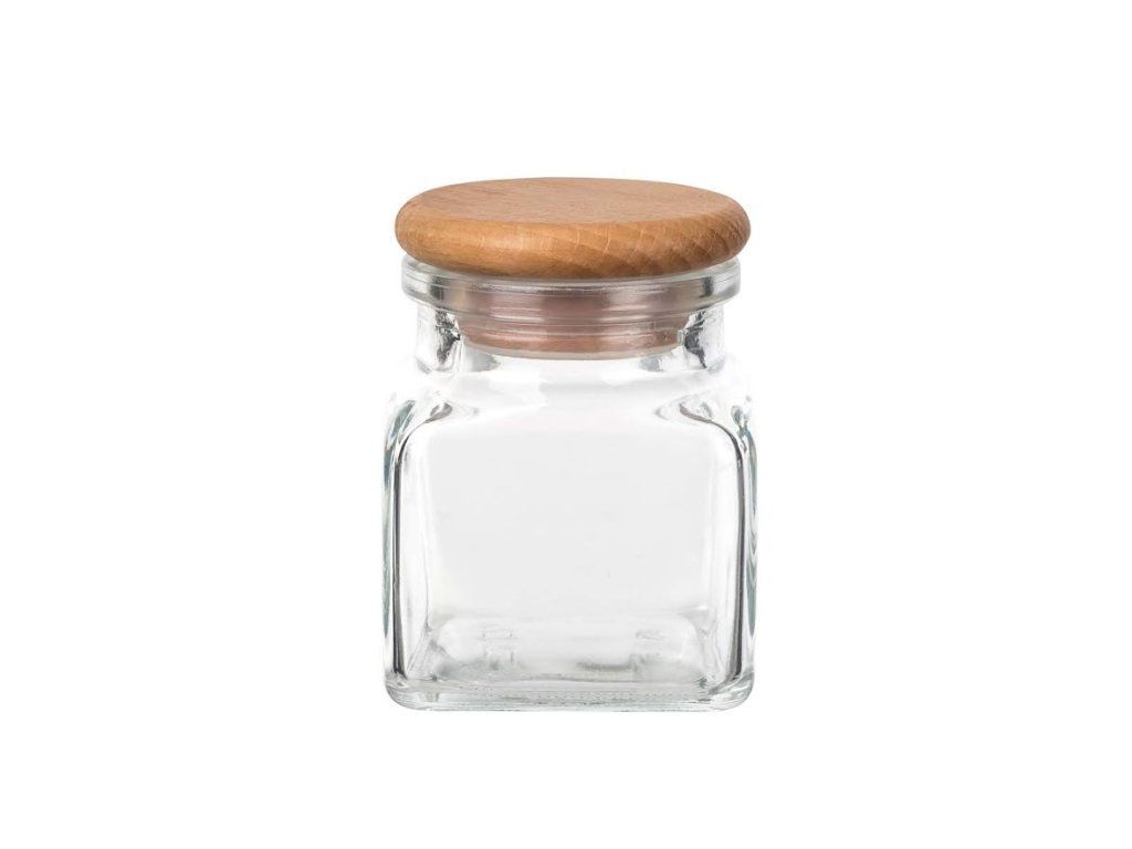 De glazen kruidenpot heeft een deksel van beukenhout dat is voorzien van een perfect passend deksel.