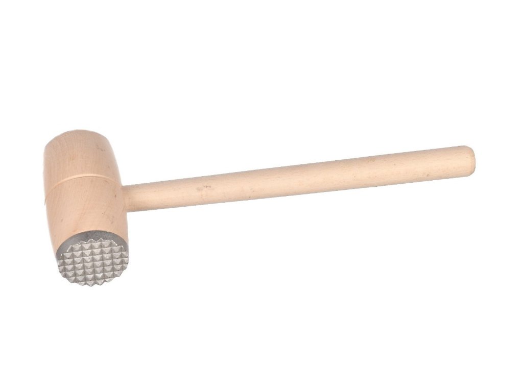 Klassieke houten vleesstamper, die aan de ene kant metaal heeft, is een belangrijk onderdeel van elke keuken. Het is robuust en toch werkt het goed en ligt het uitstekend in de hand.