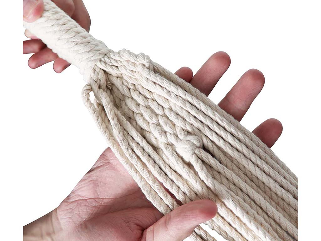 De textiele hangmat kan sporen en onregelmatigheden vertonen die typisch zijn voor handwerk. We raden aan om met de hand te wassen, gebruik geen wasmachine of droger.