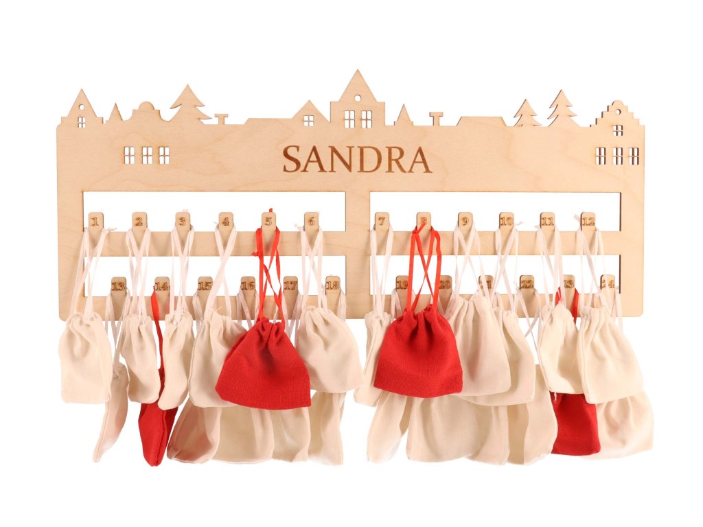 De set bevat een houten basis van de kalender van 50 cm lang, 20 natuurlijke en 4 rode katoenen zakjes van 8 x 8 cm.
