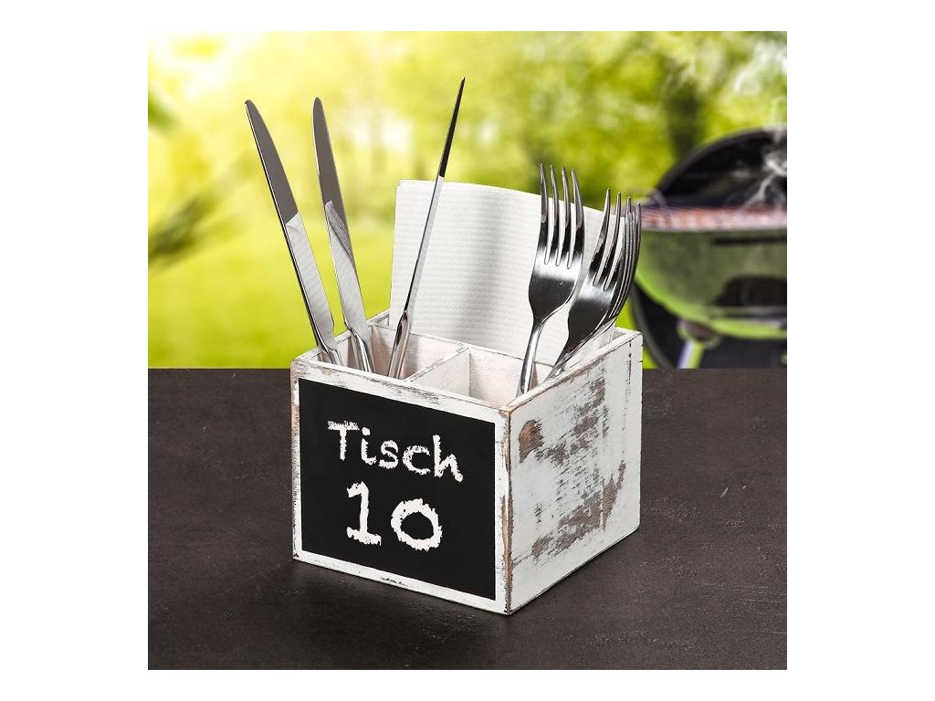 Houten vintage bestekhouder is een praktische hulp in elke keuken, eetkamer en restaurant. Op de praktische bord kunt u met krijt het tafelnummer of een grappige boodschap schrijven.