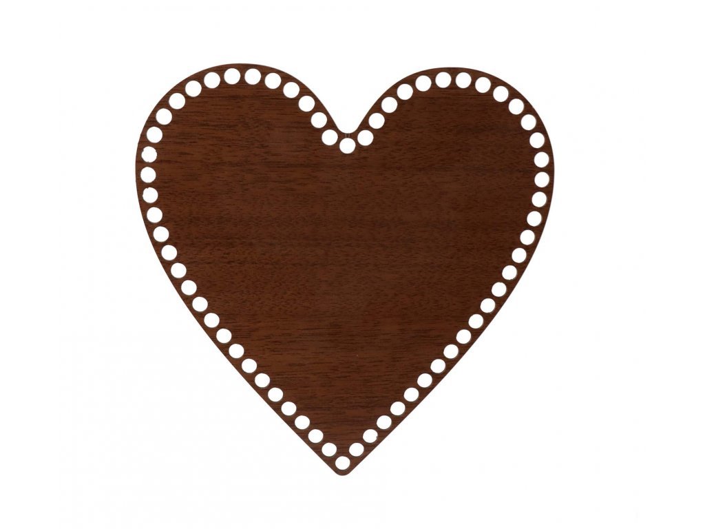 De bodem van de mand met een decor van donker notenhout in de vorm van een hart van 3 mm dik met gaten van 9 mm bieden we aan in verschillende maten. Het is geschikt voor het maken van gehaakte manden van jute- en koordgaren.