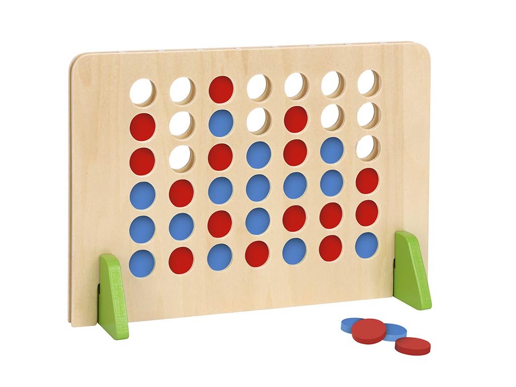 Het massief houten spelbord heeft gaten waarin rode en blauwe wielen van bovenaf kunnen worden geplaatst. Spelers proberen om de beurt een aaneengesloten rij van vier wielen te maken – horizontaal, verticaal of diagonaal.