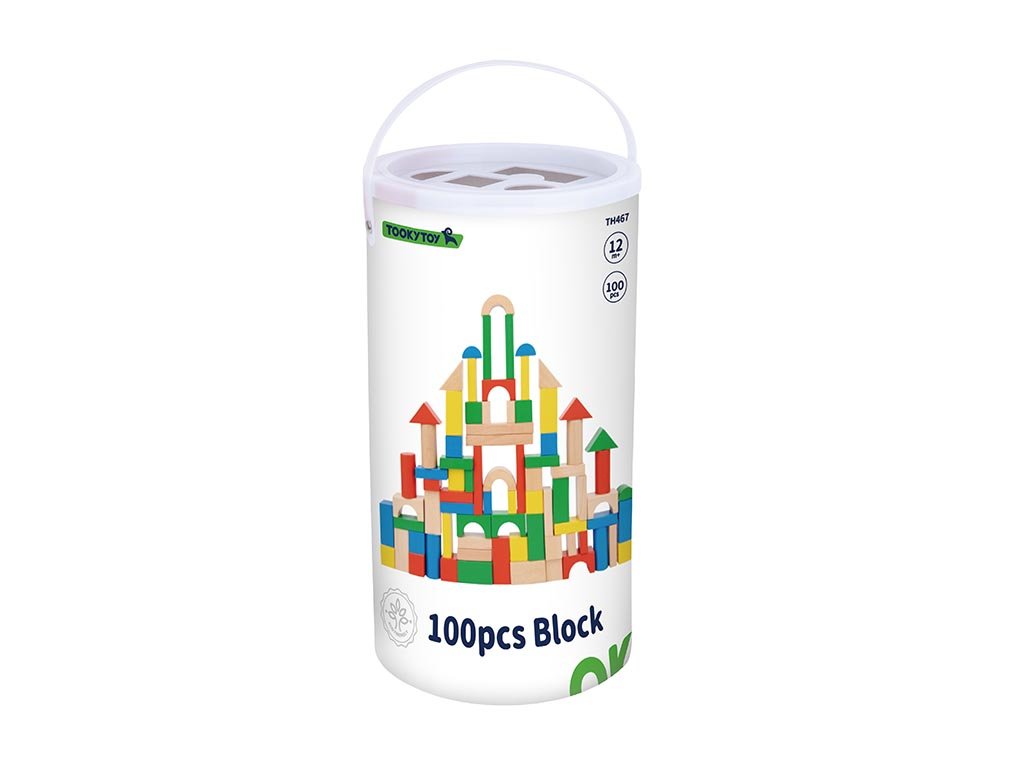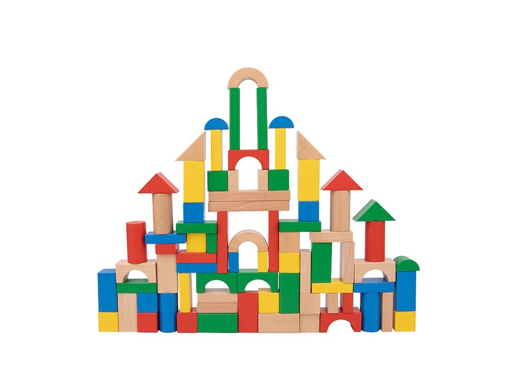 - 100 stukjes in verschillende vormen, genoeg kubussen voor grote bouwwerken en samen spelen.