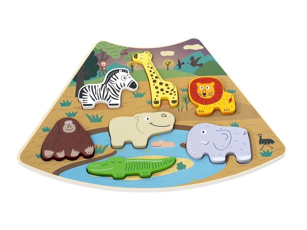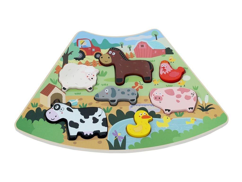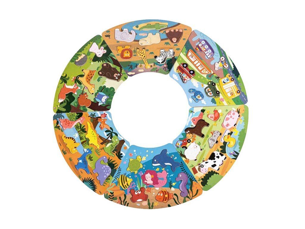 Deze kleurrijke houten cirkelpuzzel stimuleert op speelse wijze het logisch denkvermogen en de motoriek van kinderen. De set bestaat uit zes verbindbare delen die samen een cirkel vormen, gevuld met kleurrijke en gevarieerde taferelen.
