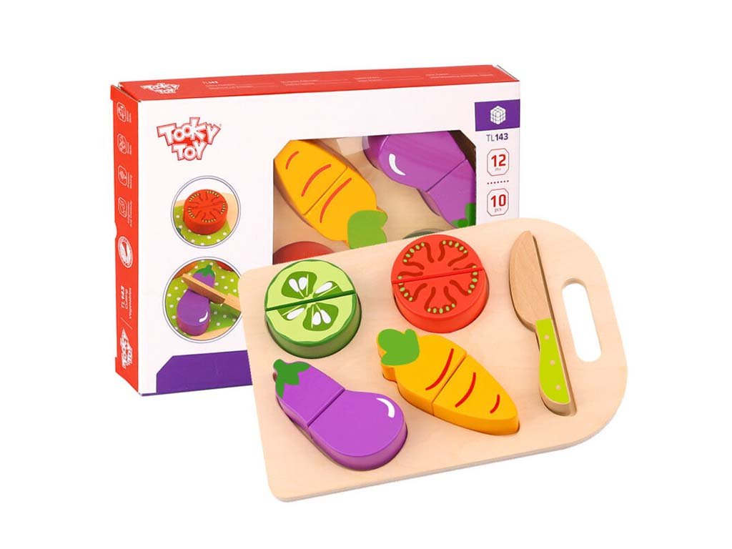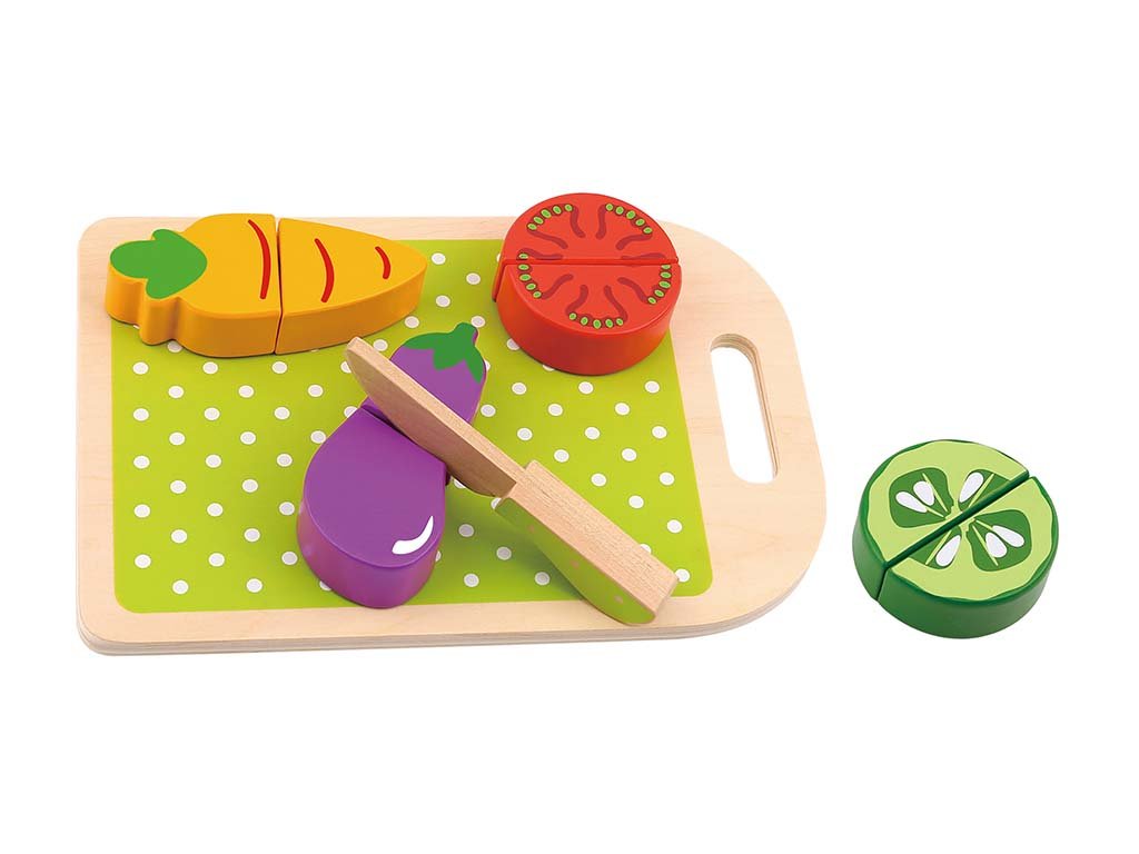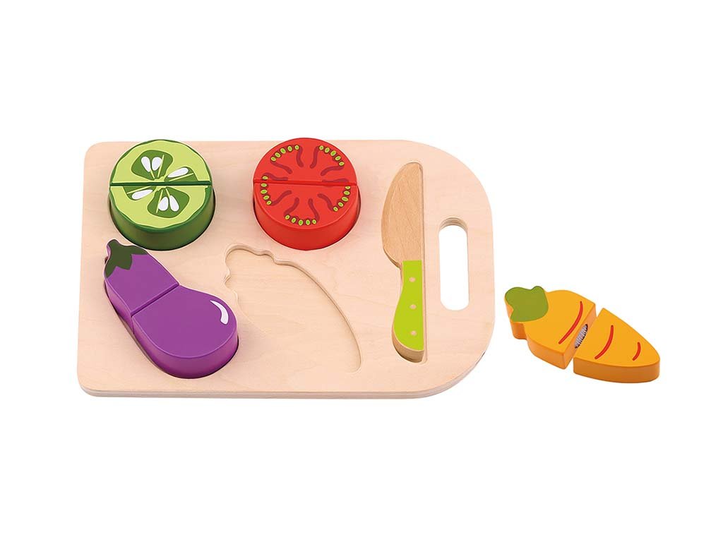 Een veilig en creatief speeltje waarmee kinderen denkbeeldige snacks kunnen bereiden. Bevat kleurrijke stukjes groente, een houten snijplank en een mes - een ideale aanvulling op een kinderkeuken of winkel.