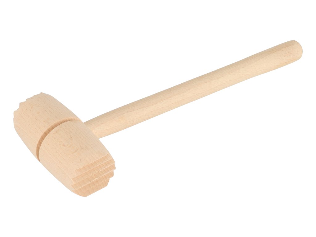 Klassieke houten vleesstamper. Aan beide zijden heeft het houten punten - aan de ene kant puntig, aan de andere kant langwerpig. Het is perfect voor het kloppen van vlees zonder de vezels te beschadigen.