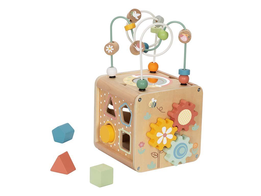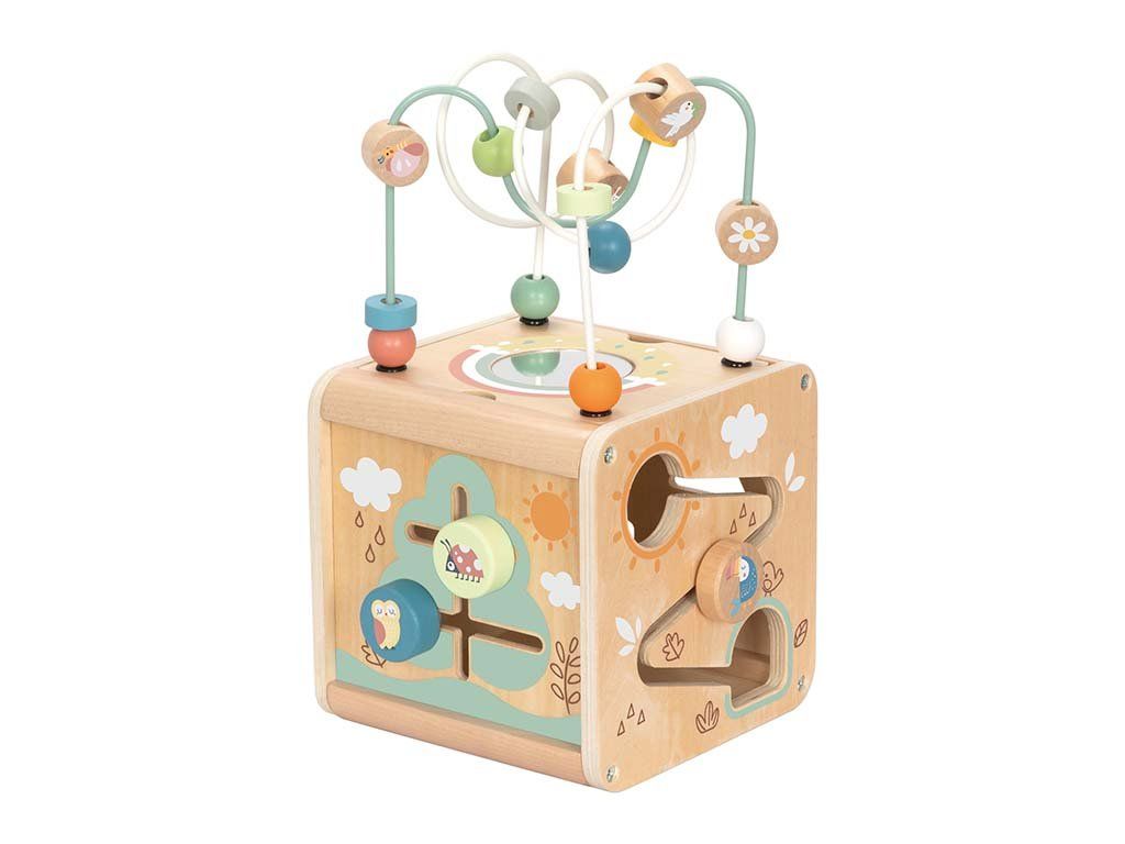 De kubus is gemaakt van hoogwaardig hout en versierd met subtiele natuurmotieven die een rustgevende en speelse uitstraling hebben. Dankzij de afwisselende activiteiten leren kinderen spelenderwijs vormen en kleuren herkennen en verbeteren ze hun hand-oogcoördinatie.