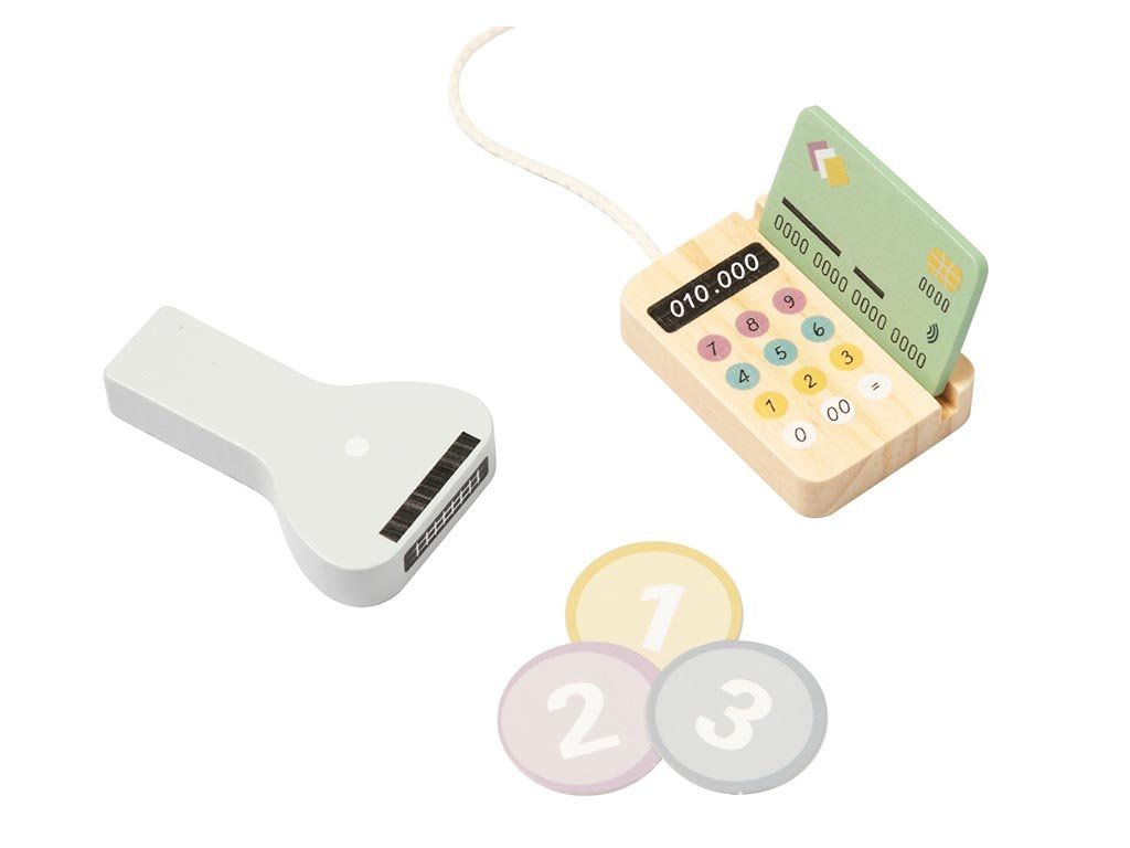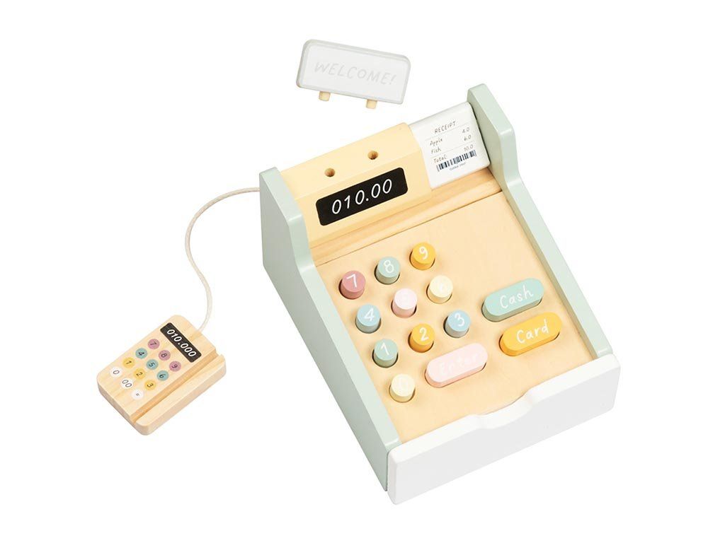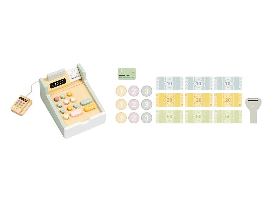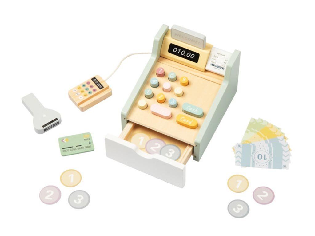 De kassa is voorzien van realistische houten munten en biljetten, knoppen en een praktische geldlade die eenvoudig open en dicht kan. Hierdoor kunnen kinderen verkoper, klant of zelfs een complete winkelsituatie naspelen met vrienden of familie. Het spel stimuleert de verbeelding, creativiteit en sociale interactie.