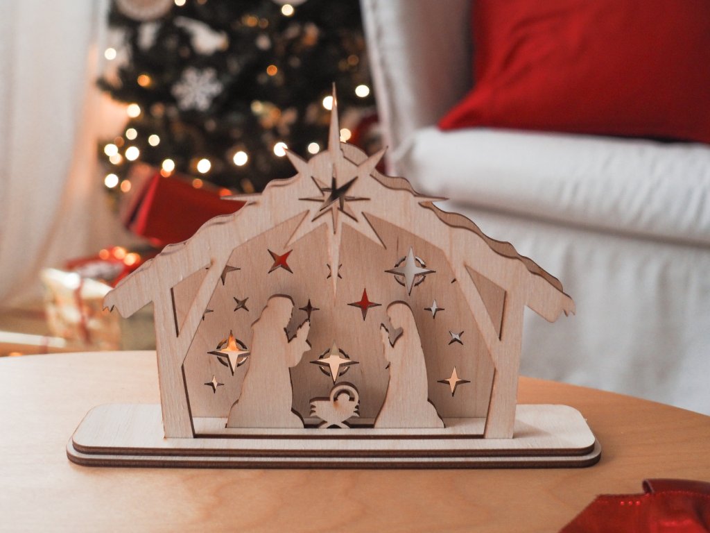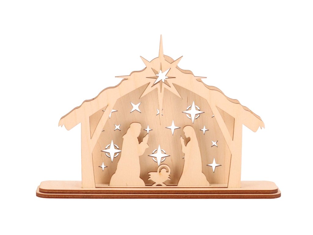 De kerststal van berkenmultiplex is een populaire feestdecoratie. Kleine details zijn nauwkeurig met een laser uitgesneden en dankzij de stevige basis kun je de kerststal op de vensterbank, plank of commode plaatsen.