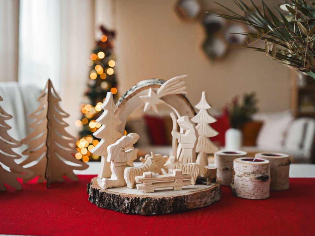 Versierd met handgemaakte figuren die de gezellige kerstsfeer verbeteren.