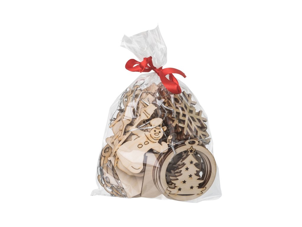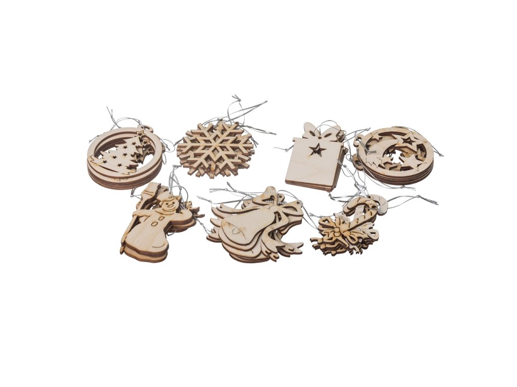 Houten kerstversieringen gemaakt met de techniek van lasergraveren. In de verpakking vindt u een houten boom, een sneeuwvlok, een cadeautje, een komeet, een sneeuwpop, een bel en een toverstok.