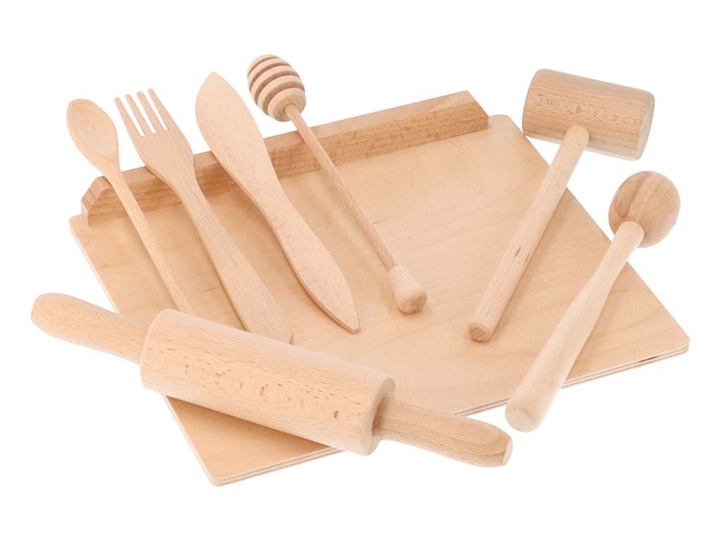 Het imiteren van ouders tijdens hun dagelijkse activiteiten is zeer populair bij kinderen. Dus waarom zouden we ze dat niet gunnen? De houten set keukengerei stelt kinderen in staat om creatief hun tijd door te brengen, ontwikkelt hun fijne motoriek en biedt vooral eindeloos veel plezier.