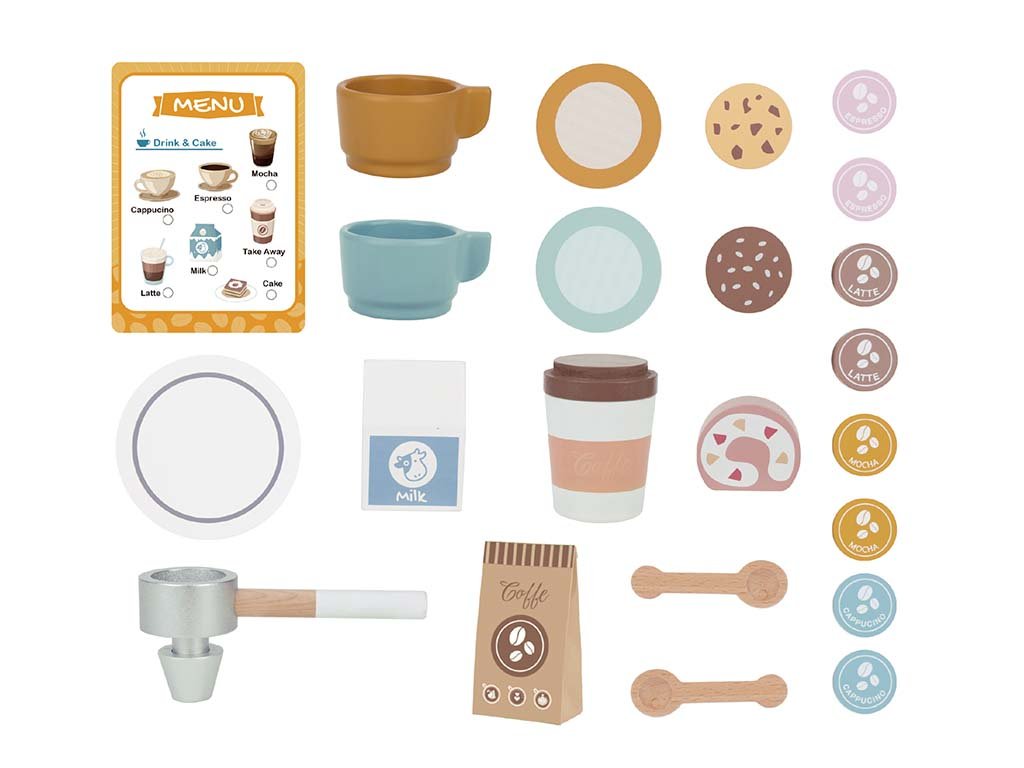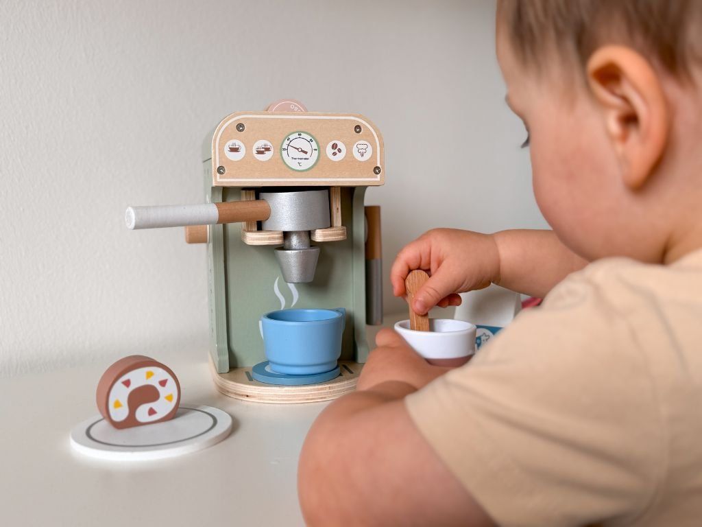 Met het kleurrijke houten koffiezetapparaat kunnen kinderen “espresso”, “latte” of zelfs “thee” maken en serveren aan het hele gezin en hun knuffelvrienden. Het resultaat is cafeïnevrij, maar vol vrolijkheid!