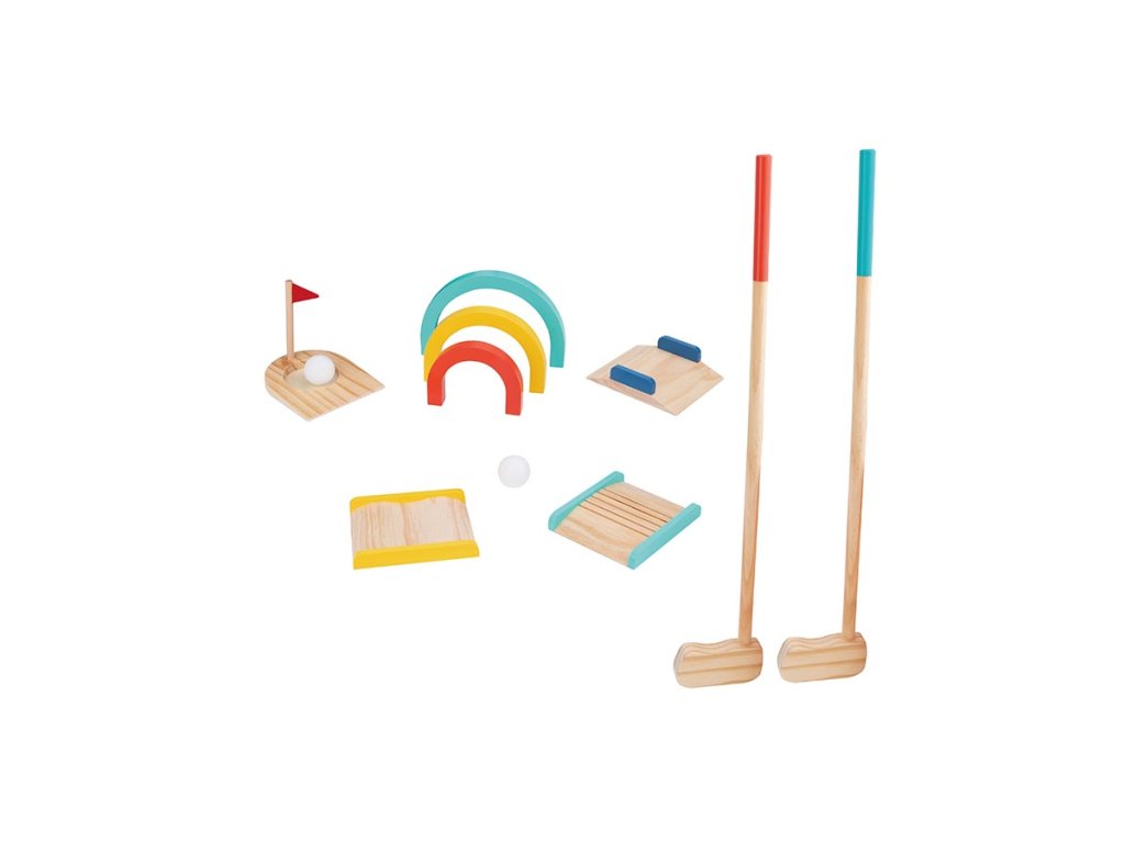 Houten minigolf voor kinderen brengt sportplezier rechtstreeks naar de kinderkamer of tuin. Het spel bestaat uit het slaan van de bal in de daarvoor bestemde doelen met een klein houten stokje. Kinderen beleven veel speelplezier en ontwikkelen tegelijkertijd coördinatie, nauwkeurigheid en concentratie. Minigolf is ideaal om alleen of in een groep te spelen en bevordert zo ook samenwerking en een gezonde competitie.