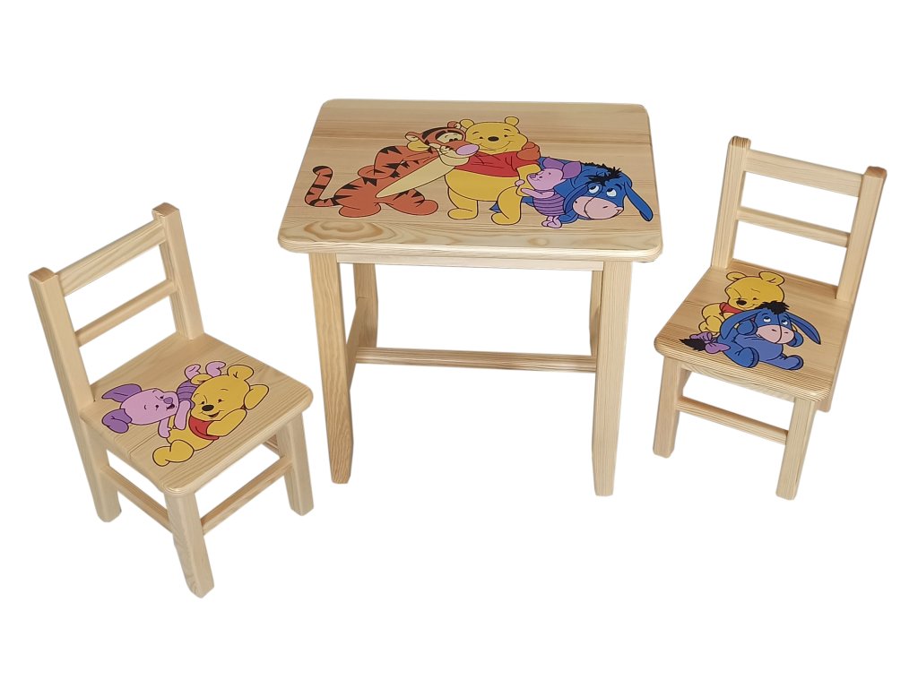 Houten set van een tafeltje en twee stoelen met het favoriete sprookjesmotief van Winnie de Poeh zal gegarandeerd de ogen van kinderen laten stralen en zal niet alleen in de kinderkamer prachtig staan.