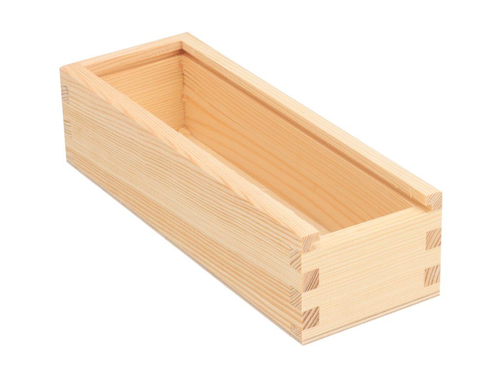 Het is gemaakt van dennenhout en multiplex. De binnenafmetingen zijn 21 x 6 x 4,5 cm.