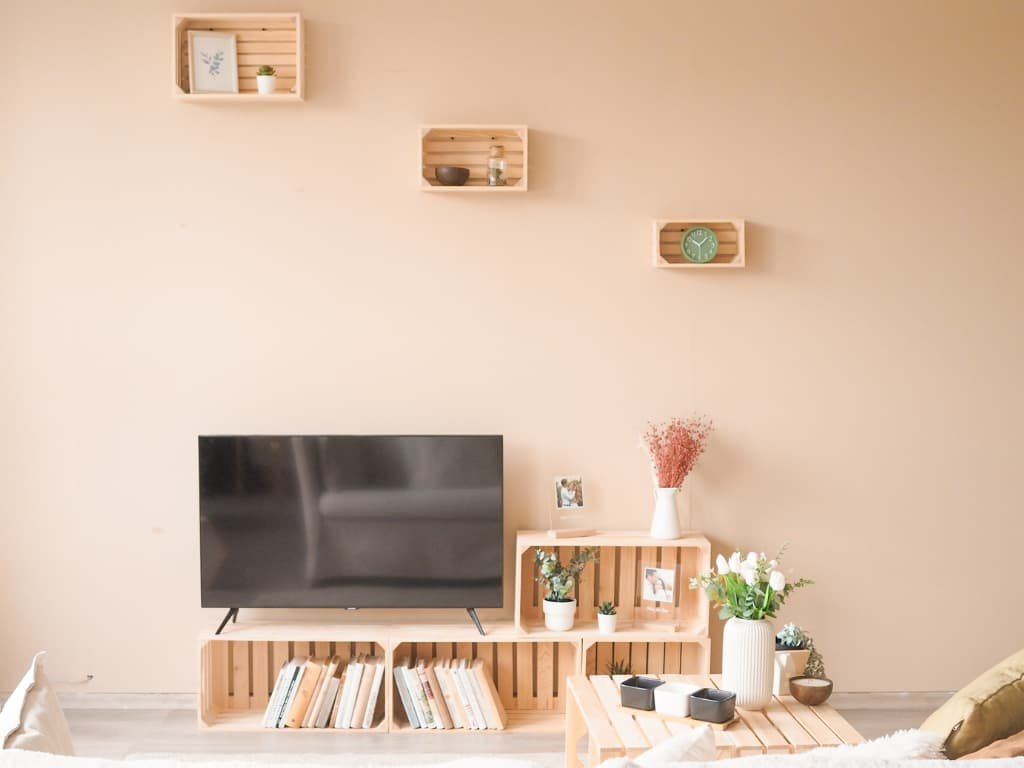 Deze woonkamerwand is samengesteld uit drie kisten van 60 x 30 x 24 cm en één 40 x 30 x 24 cm. De totale afmetingen na montage zijn 160 x 60 x 24 cm, wat garandeert dat het alles wat nodig is kan bevatten. De draagkracht van elke doos is ongeveer 20 kg.
