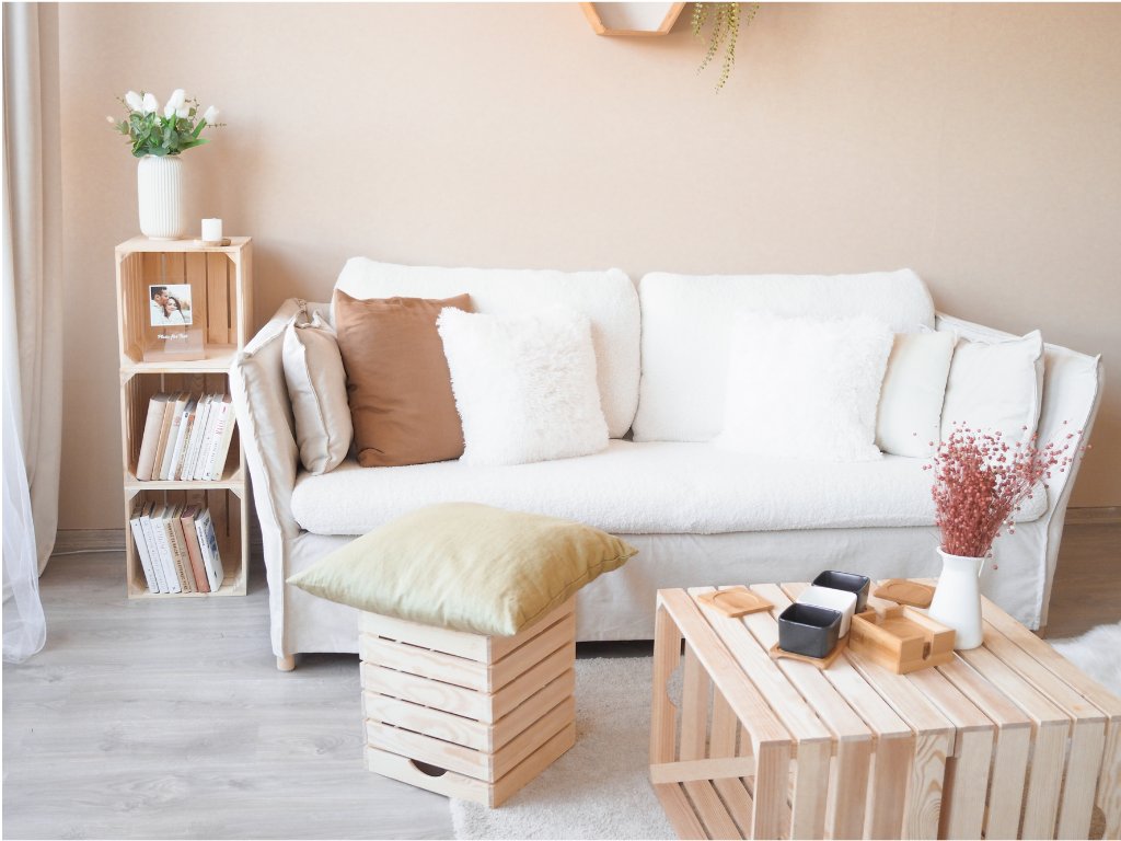 Vers en natuurlijk, zo is het meubilair van houten dozen. Het zitkussen van de houten doos heeft afmetingen van 30x30x35 cm.