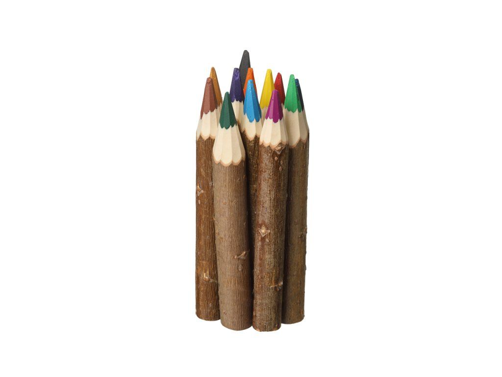 Houten kleurpotloden gemaakt van onbewerkte ronde hazelaar, die gevuld is met een kleurpotlood. Er is dus een set van 12 houten kleurpotloden beschikbaar.