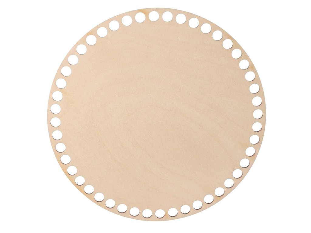 Ronde houten bodem voor de mand van berken multiplex dient als basis voor gehaakte accessoires voor in huis. Aan de rand zijn er openingen met een diameter van 9 mm en in het aanbod hebben we verschillende maten.