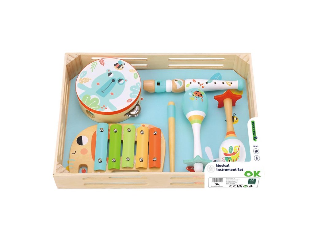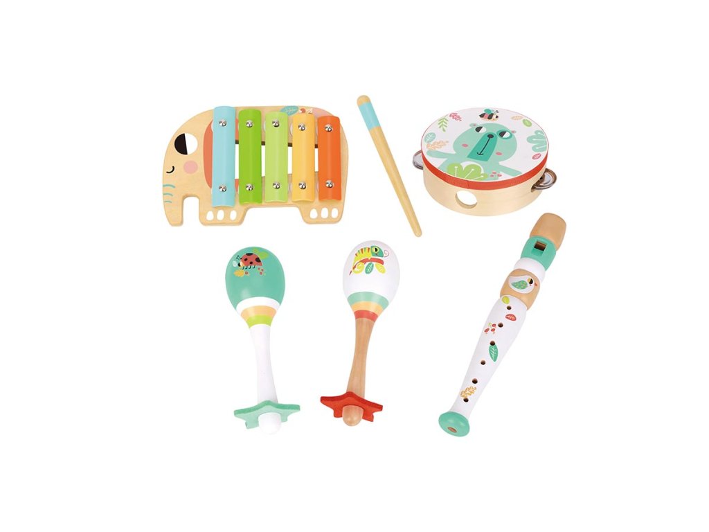 De instrumentenset bestaat uit een xylofoon, rammelaars, een fluit en een tamboerijn.