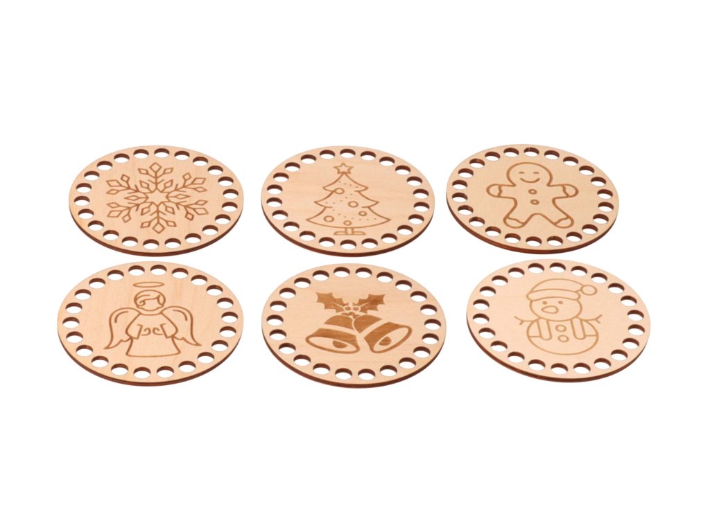 Collectie van 6 ronde uitsneden van berken multiplex met kerstmotief dient voor het maken van stijvolle onderzetters, gehaakte manden en organizers. In ons aanbod hebben we meer maten en geschikte garen vindt u ook bij ons.