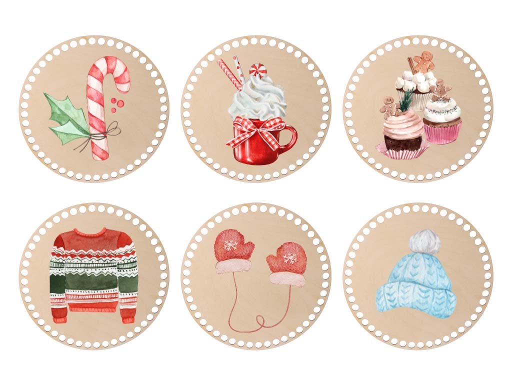 Zes ronde uitsparingen van berkenmultiplex met een warme kerstmotief zijn geschikt voor het maken van stijlvolle onderzetters, die uw interieur zullen opfleuren. In ons aanbod hebben we meer maten en geschikte garens vindt u ook bij ons.