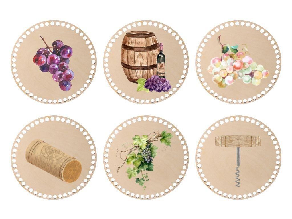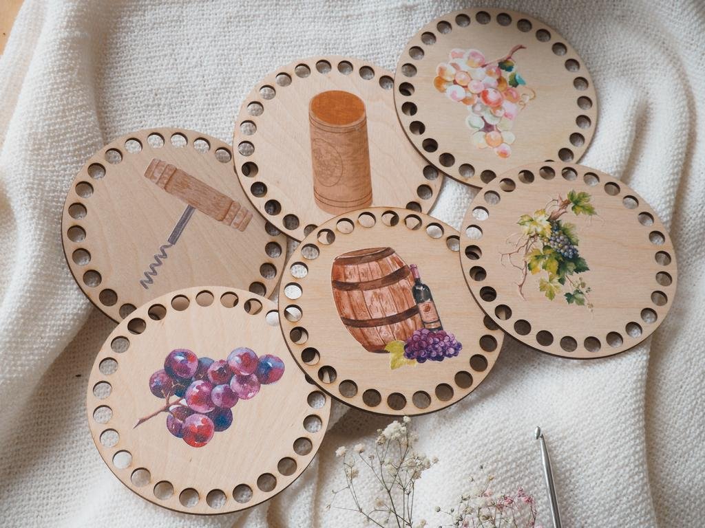 Zes ronde uitsparingen van berken multiplex met een wijnmotief zijn perfect voor het maken van stijlvolle coasters, die uw interieur zullen opfleuren. In ons aanbod hebben we meer maten en geschikte garen vindt u ook bij ons.