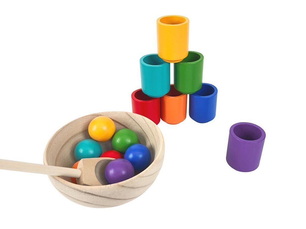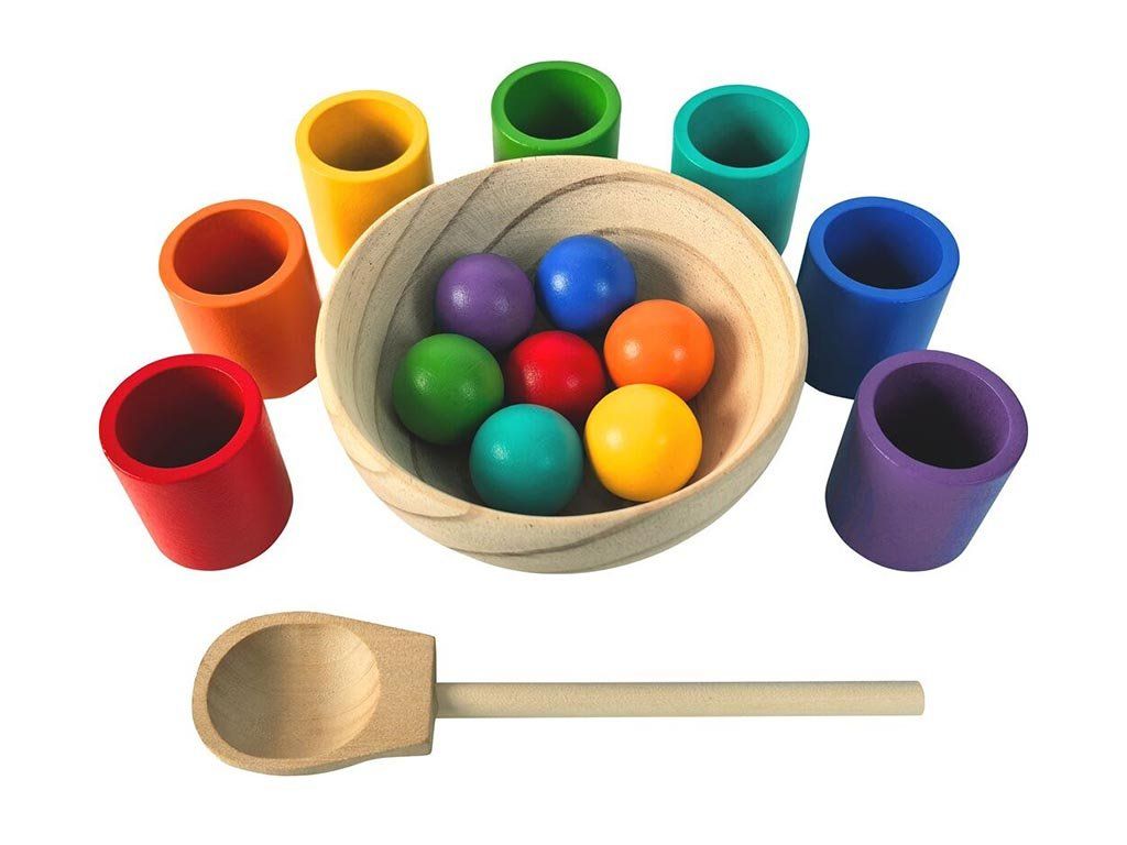 Ontdek de magie van spelenderwijs leren met deze houten, Montessori-geïnspireerde educatieve set. De kleurrijke regenboogballen en -bekers helpen kinderen bij het ontwikkelen van hun fijne motoriek, concentratie en kleurherkenning – en dat alles op een leuke en speelse manier.