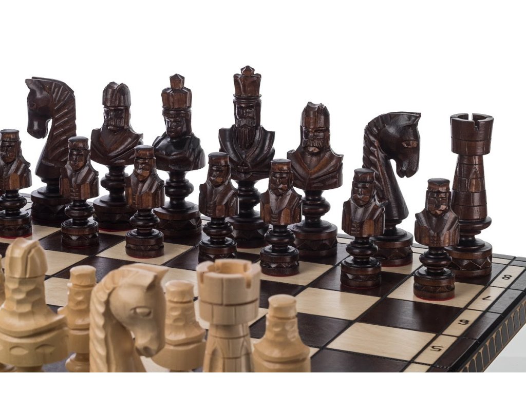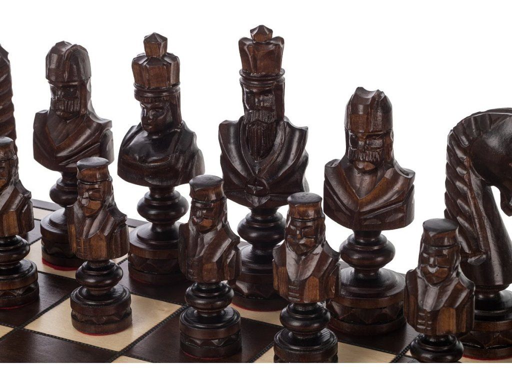 Tot in detail uitgewerkte houten schaken met een ruim speelbord. De stukken zijn het resultaat van eerlijke handarbeid, wat de hele set een stempel van originaliteit geeft.