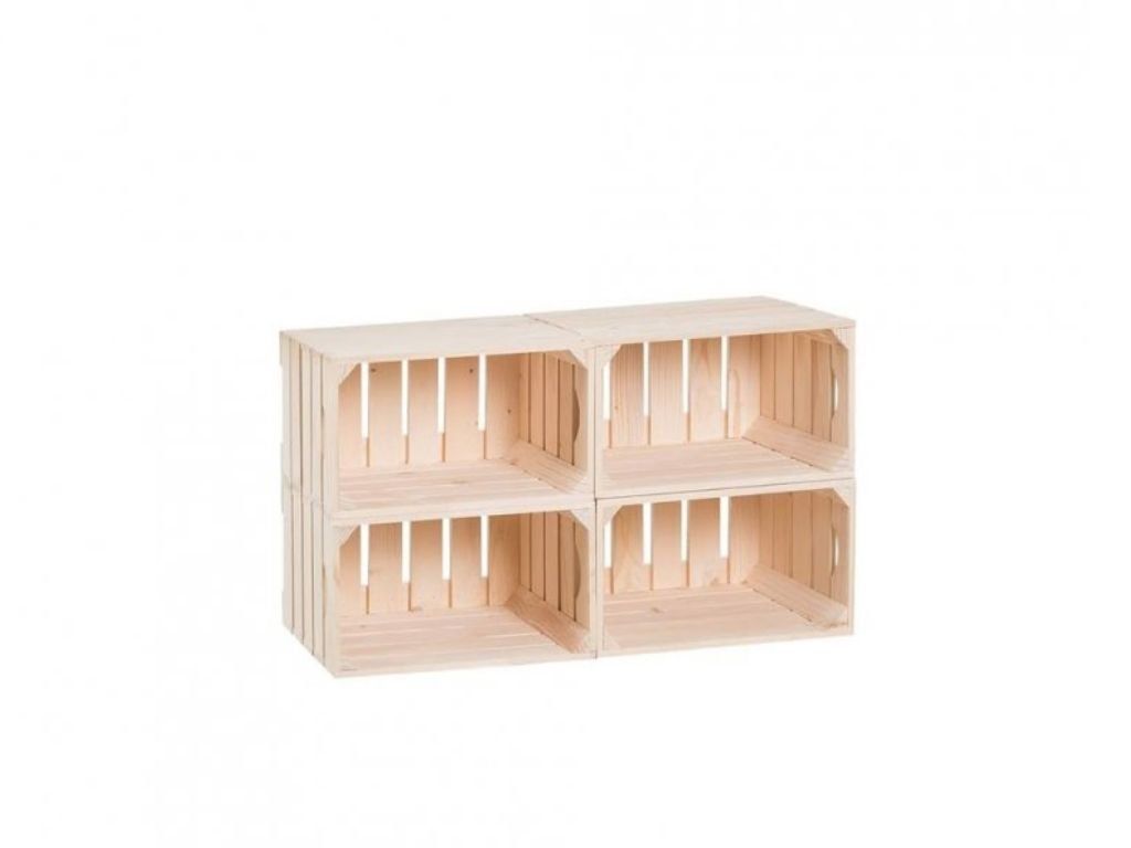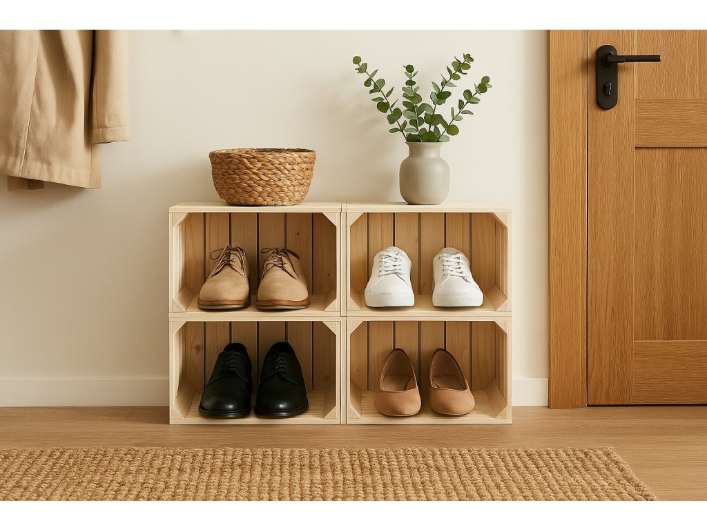 Origineel en praktisch - zo is het meubilair van natuurlijke houten kisten. De schoenenkast met totale afmetingen van 44 x 80 x 30 cm past perfect in een kleinere hal.
