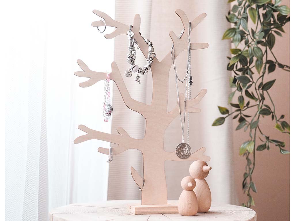 Bewaar je sieraden stijlvol op een houten boom gemaakt van berken multiplex. Het zal een onconventionele sieradenhouder in je huis worden en tegelijkertijd een interessante decoratie.