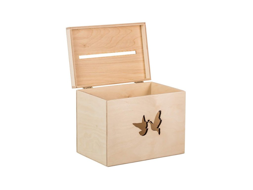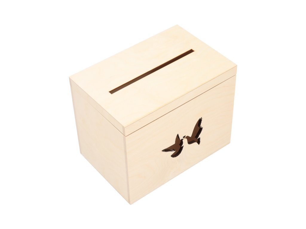 De houten trouwdoos hebben we met een laser versierd met duifjes, die het product een feestelijk karakter geven. Het is geschikt voor huwelijkswensen, maar ook voor geldgeschenken en brieven.